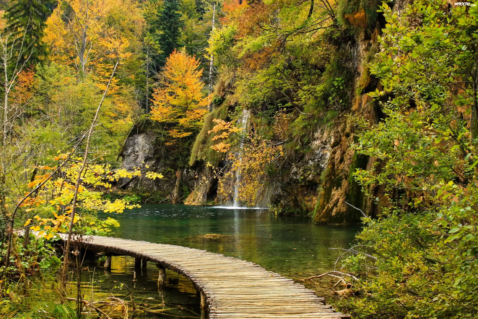 Zdjęcia, Jesień, Drzewa, Wodospad, Rzeczka, Kładka