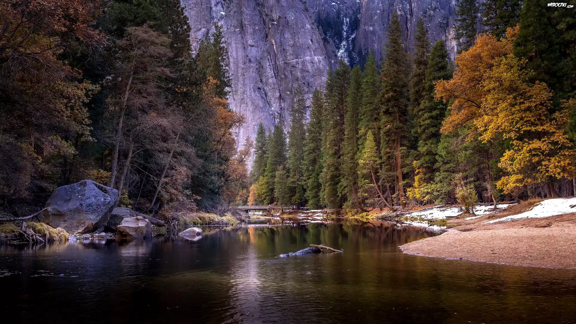 Zdjęcia, Jesień, Las, Drzewa, Góry, Skały, Brzeg, Rzeka, Kamienie, Most