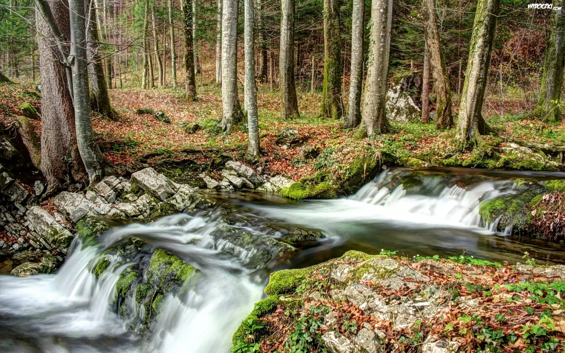 Zdjęcia, Jesień, Las, Drzewa, Rzeka, Kamienie