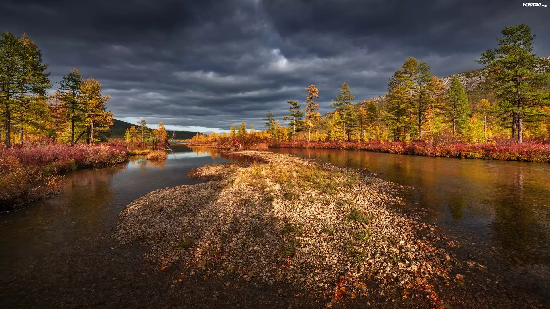 Rosja, Kołyma, Rzeka, Jesień, Wysepka, Drzewa, Chmury