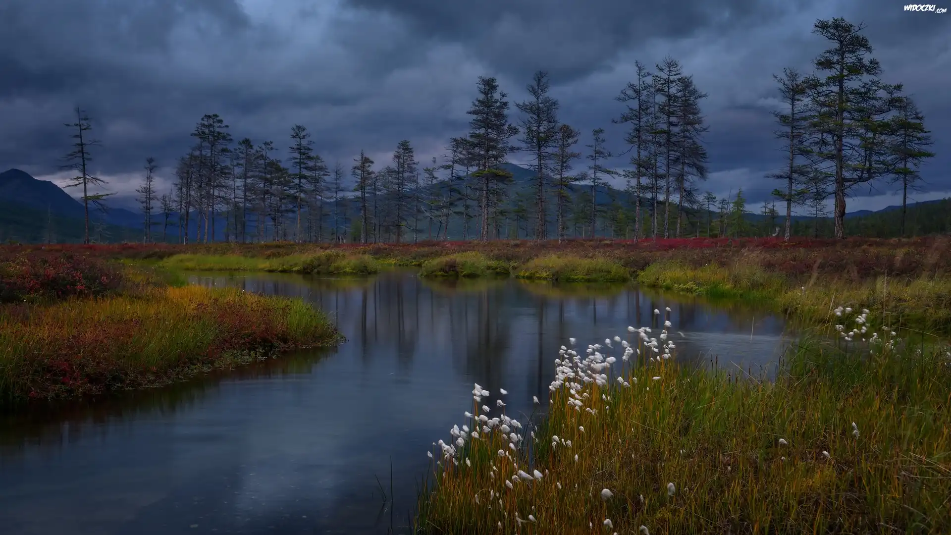 Rosja, Kołyma, Rzeka, Jesień, Chmury, Roślinność, Drzewa