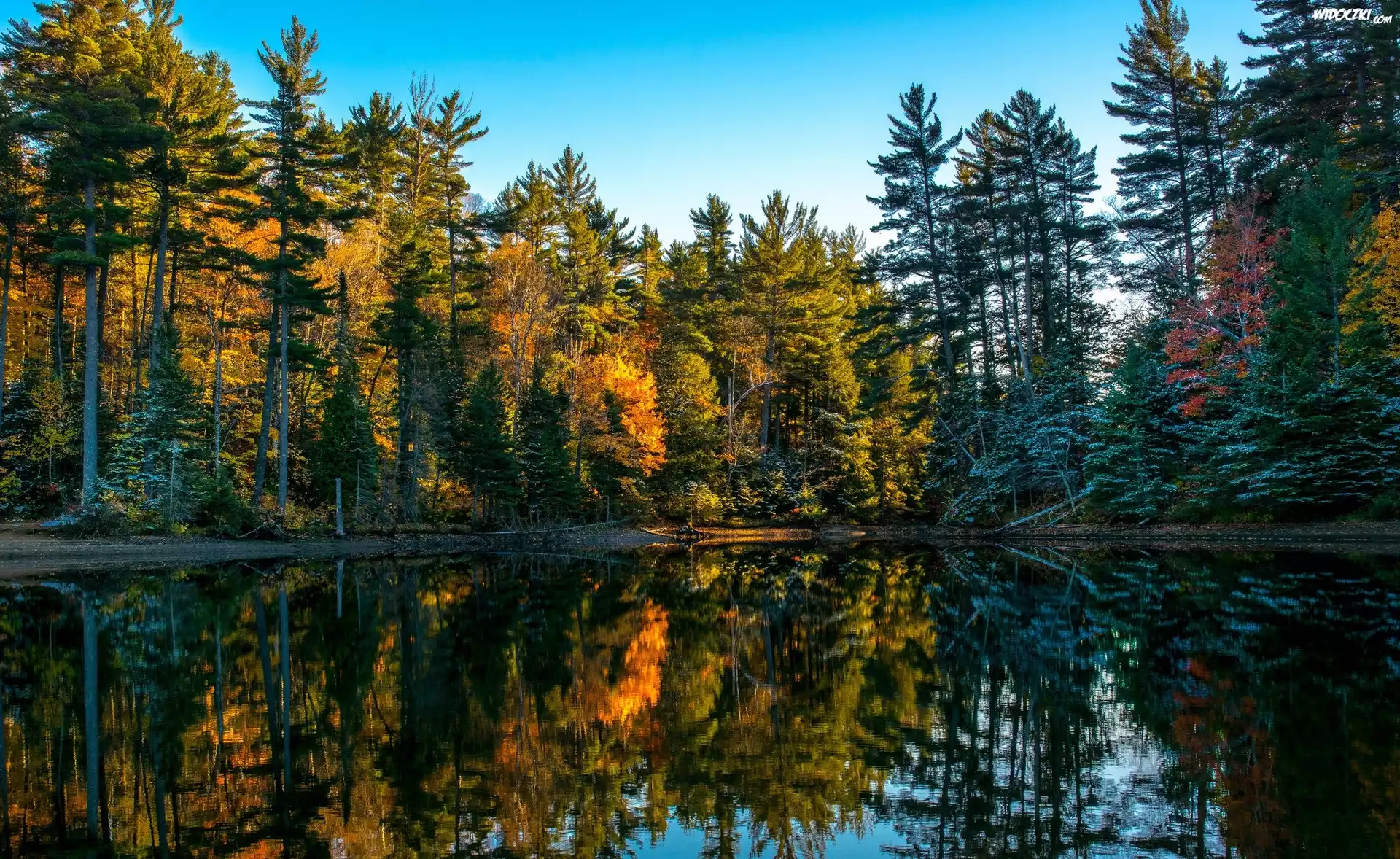 Jesień, Drzewa, Las, Rzeka, Odbicie