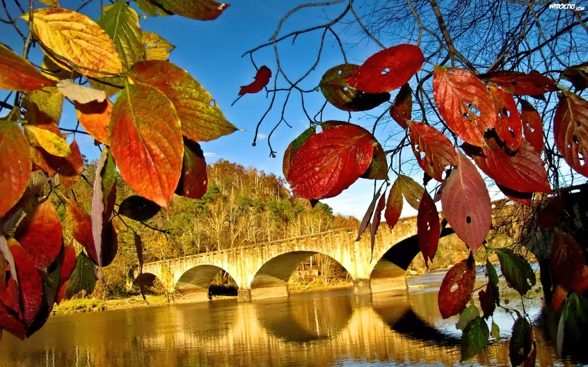 Zdjęcia, Jesień, Las, Liście, Rzeka, Most
