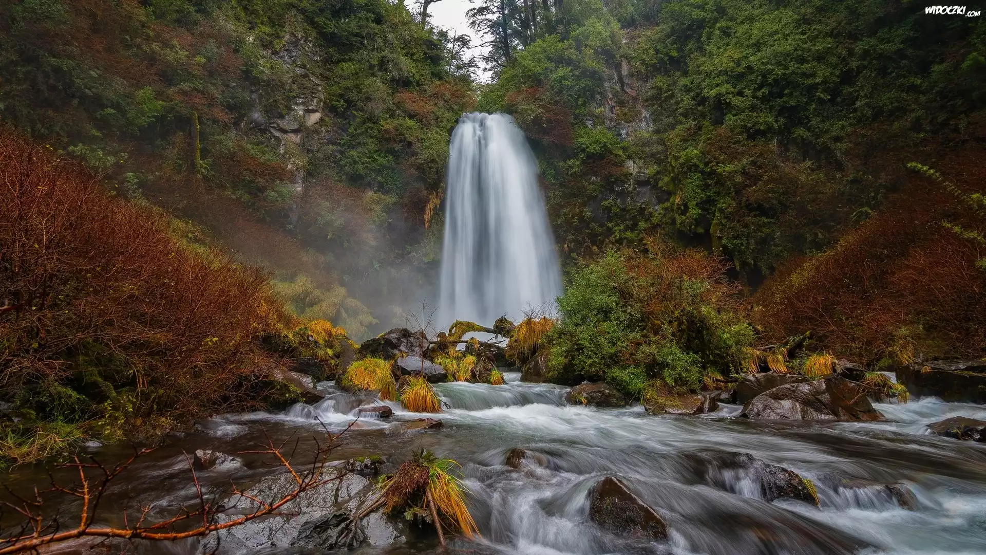 Zdjęcia, Jesień, Las, Wodospad, Rzeka, Kamienie
