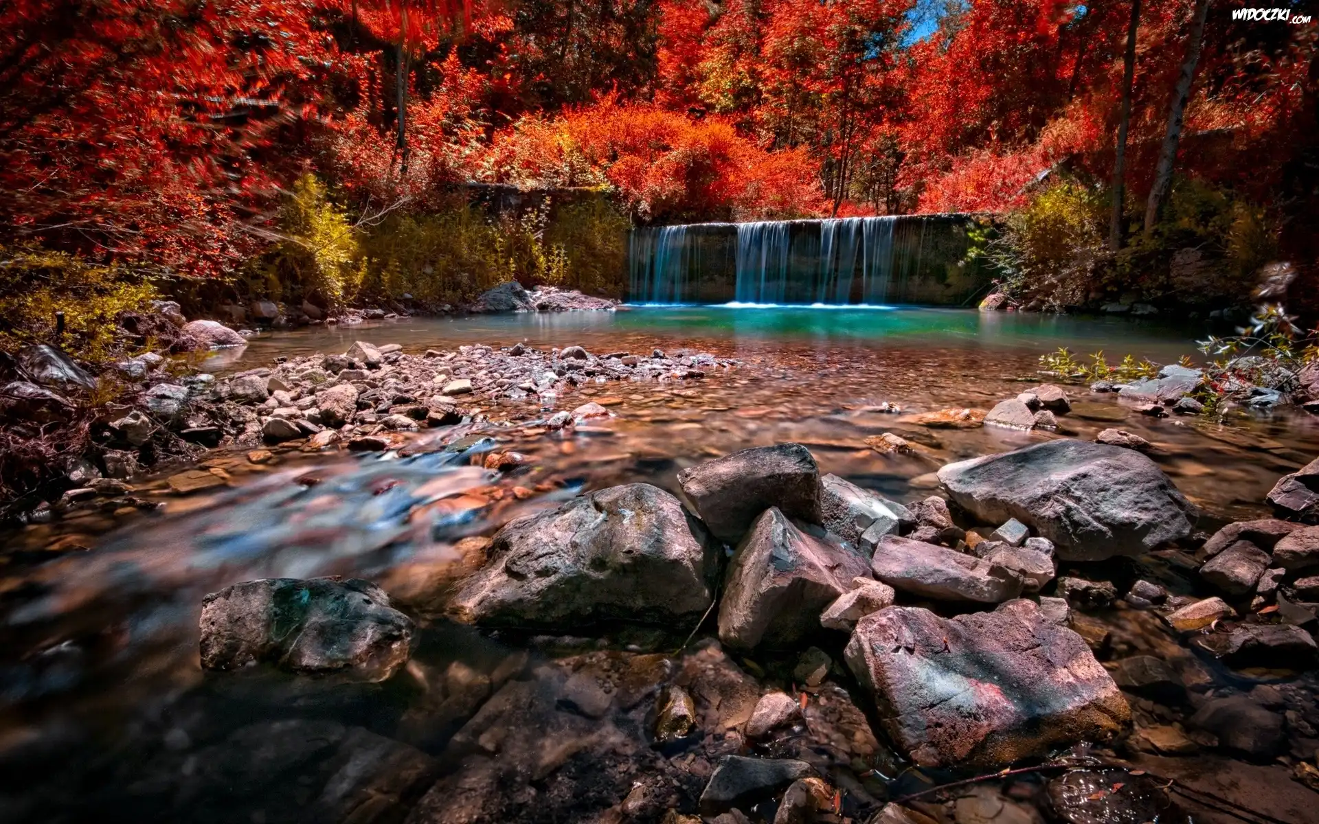 Zdjęcia, Jesień, Las, Wodospad, Rzeka, Kamienie