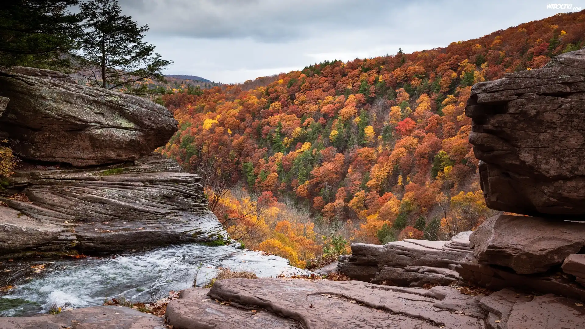 Zdjęcia, Jesień, Kolorowe, Drzewa, Skały, Rzeka