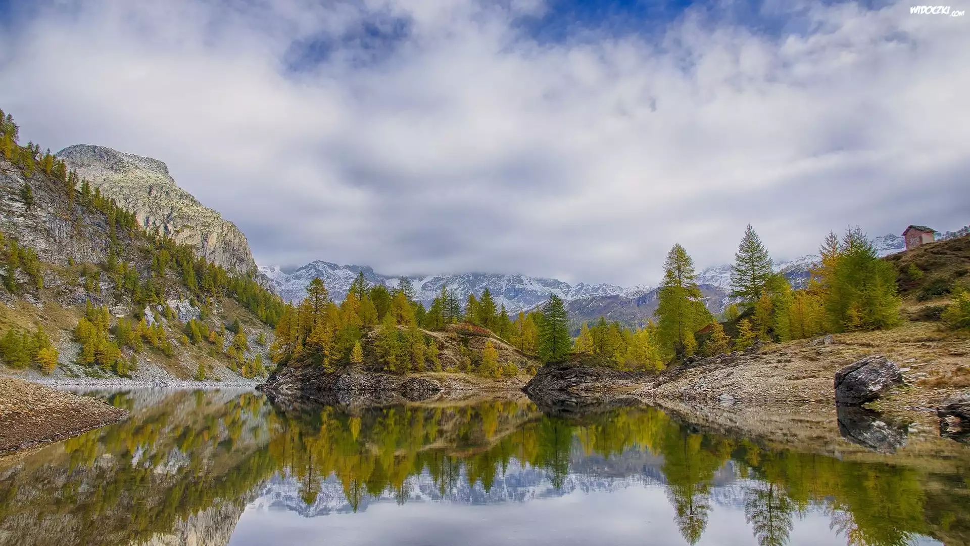 Zdjęcia, Jesień, Jezioro, Góry, Drzewa, Skały, Odbicie