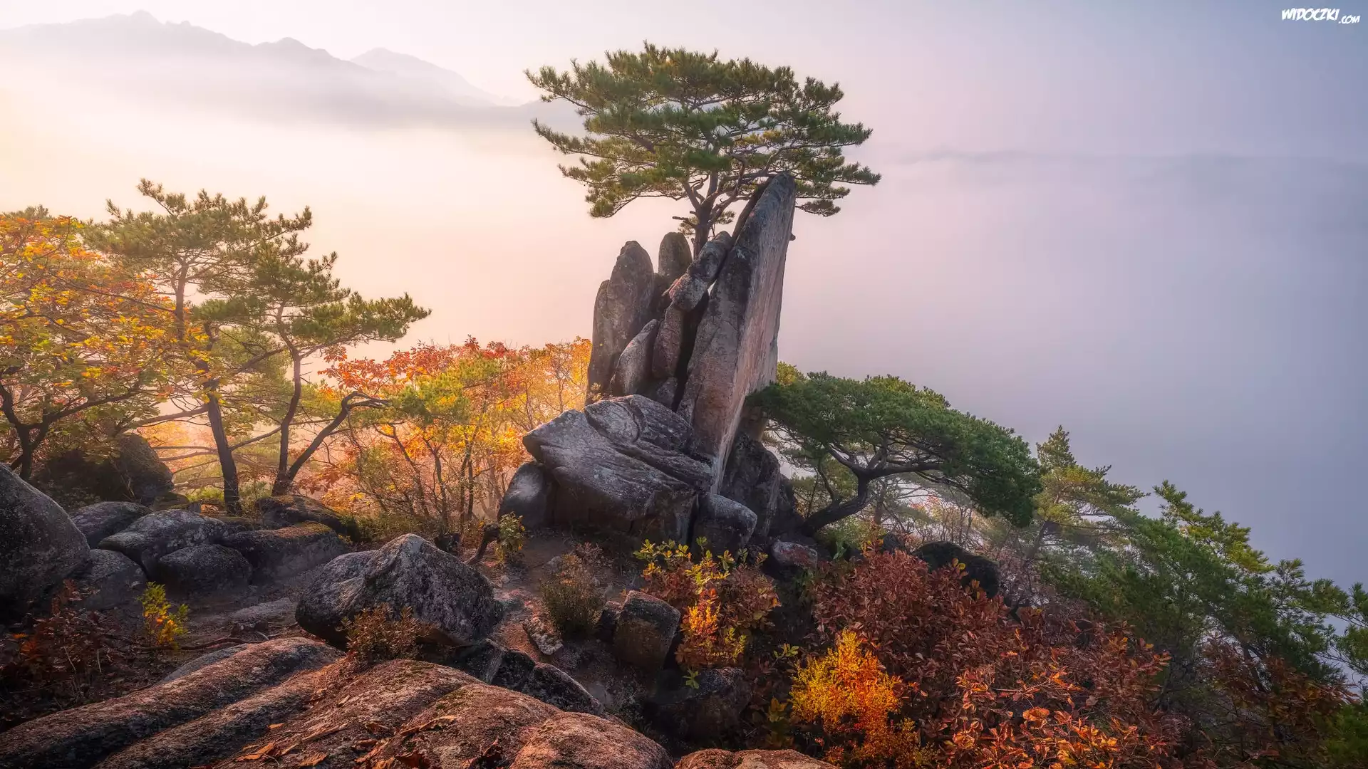 Zdjęcia, Skały, Drzewa, Mgła, Jesień