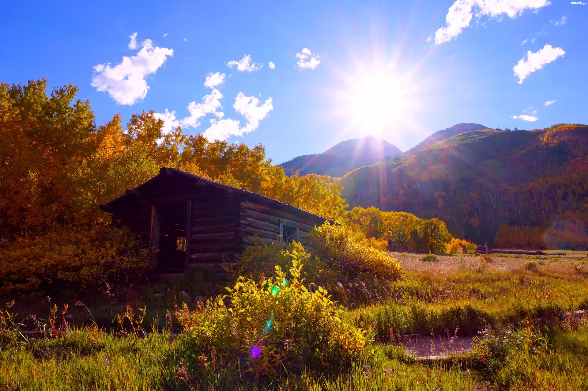 Jesień, Góry, Chatka, Promienie słońca, Drzewa