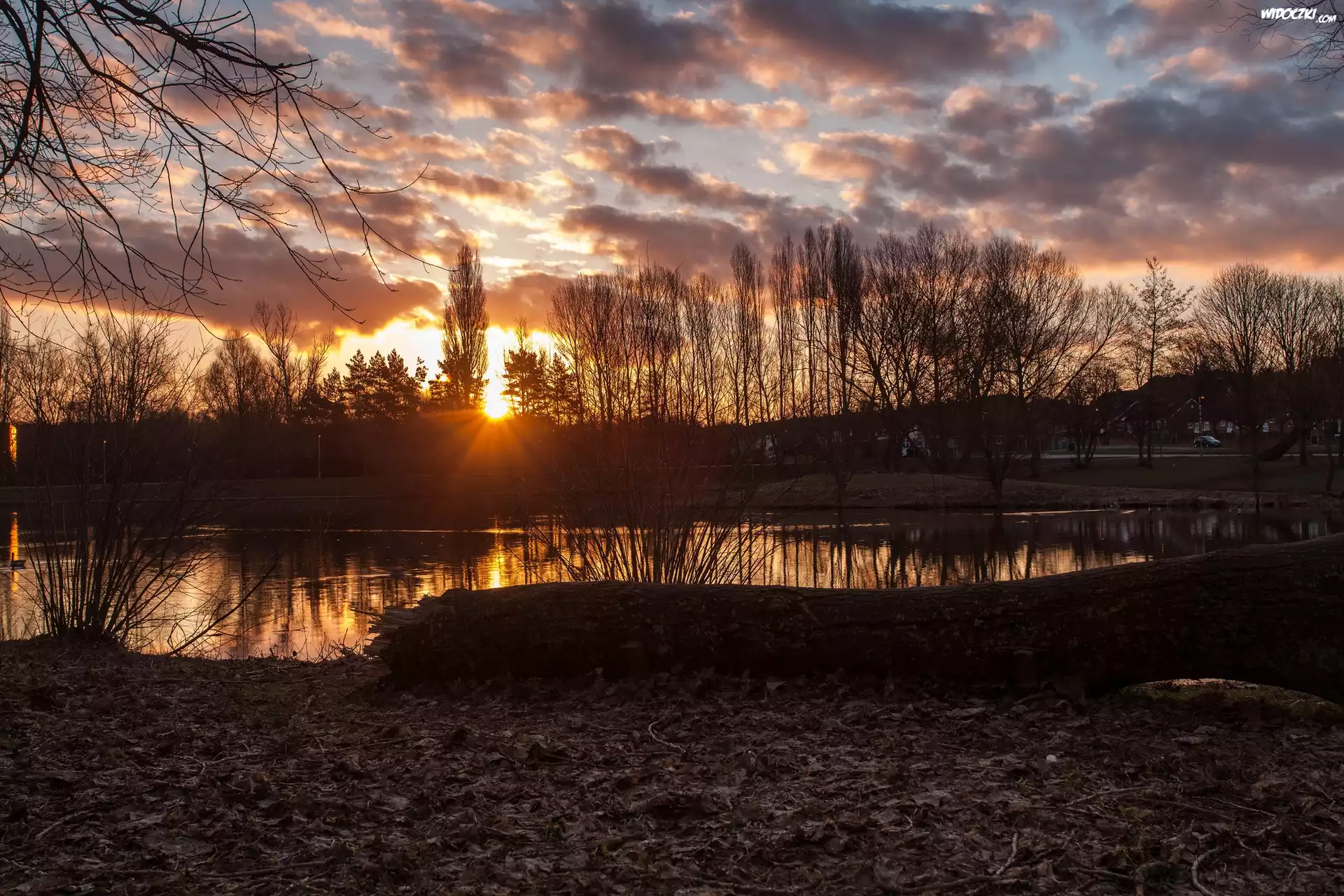 Jesień, Jezioro, Wschód, Słońca, Chmury