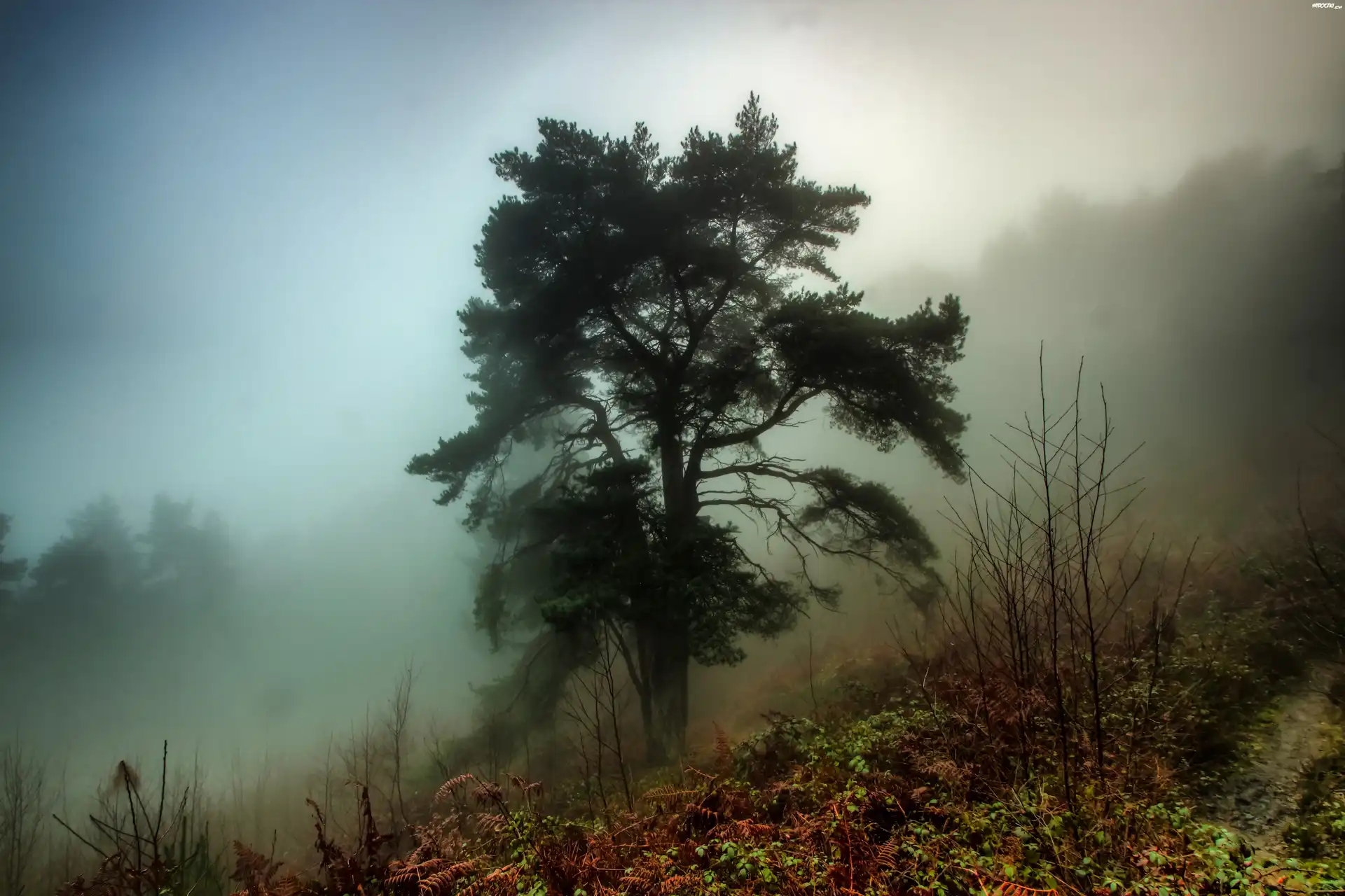 Zdjęcia, Jesień, Las, Drzewo, Sosna, Mgła