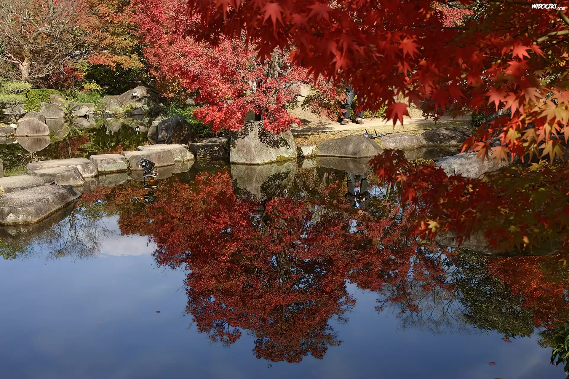 Jesień, Kolorowe, Drzewa, Staw, Kamienie
