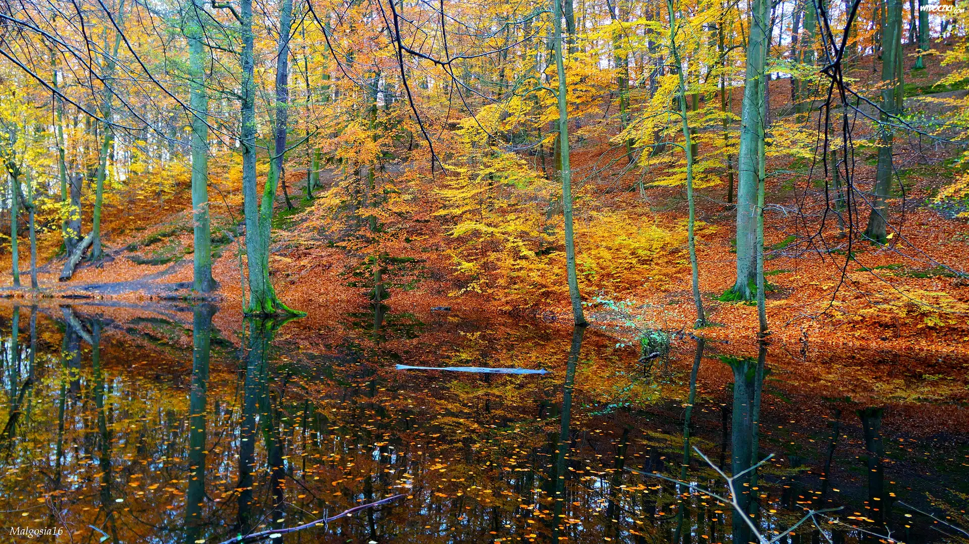 Zdjęcia, Jesień, Las, Drzewa, Staw, Woda