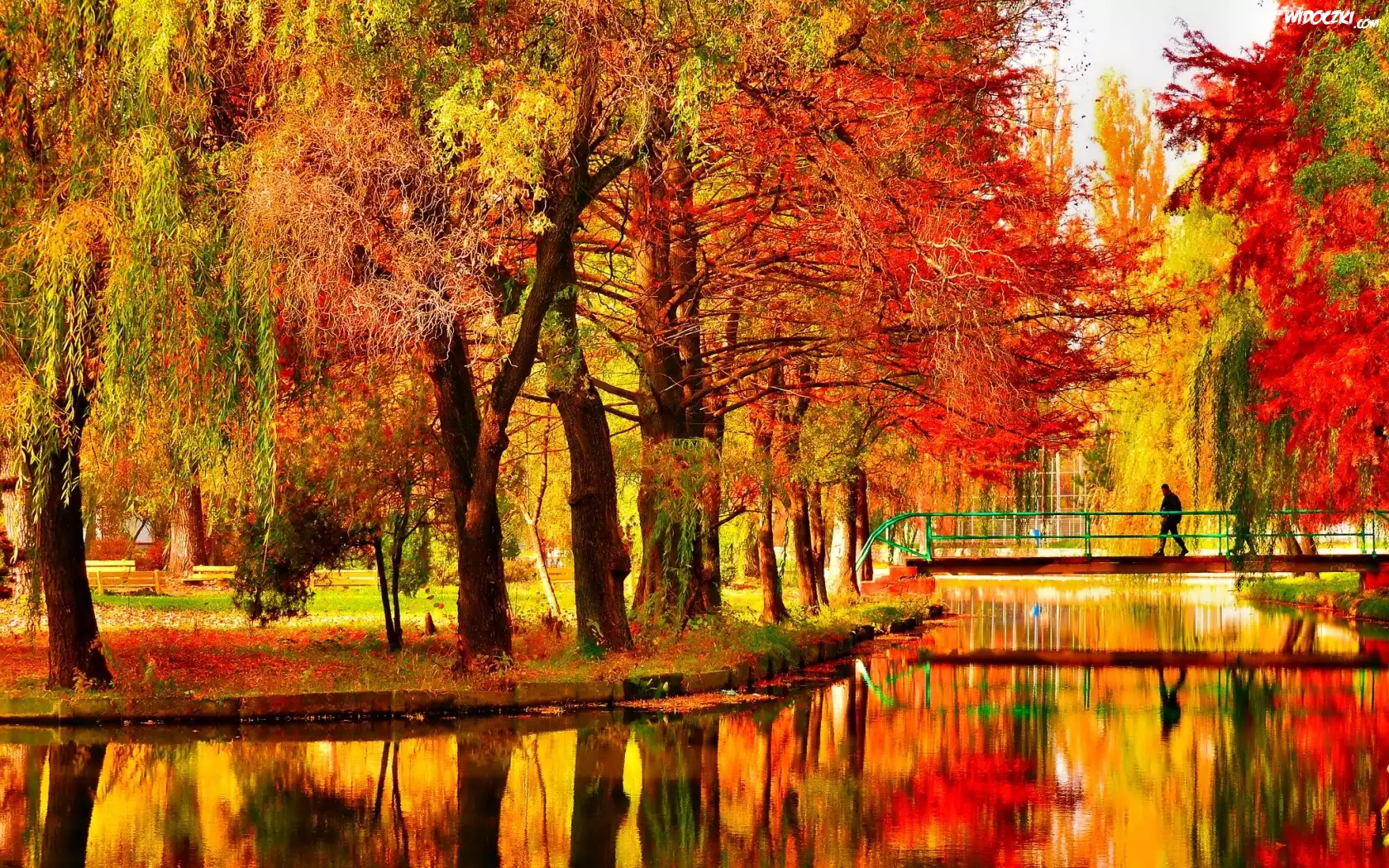 Zdjęcia, Jesień, Park, Staw, Mostek