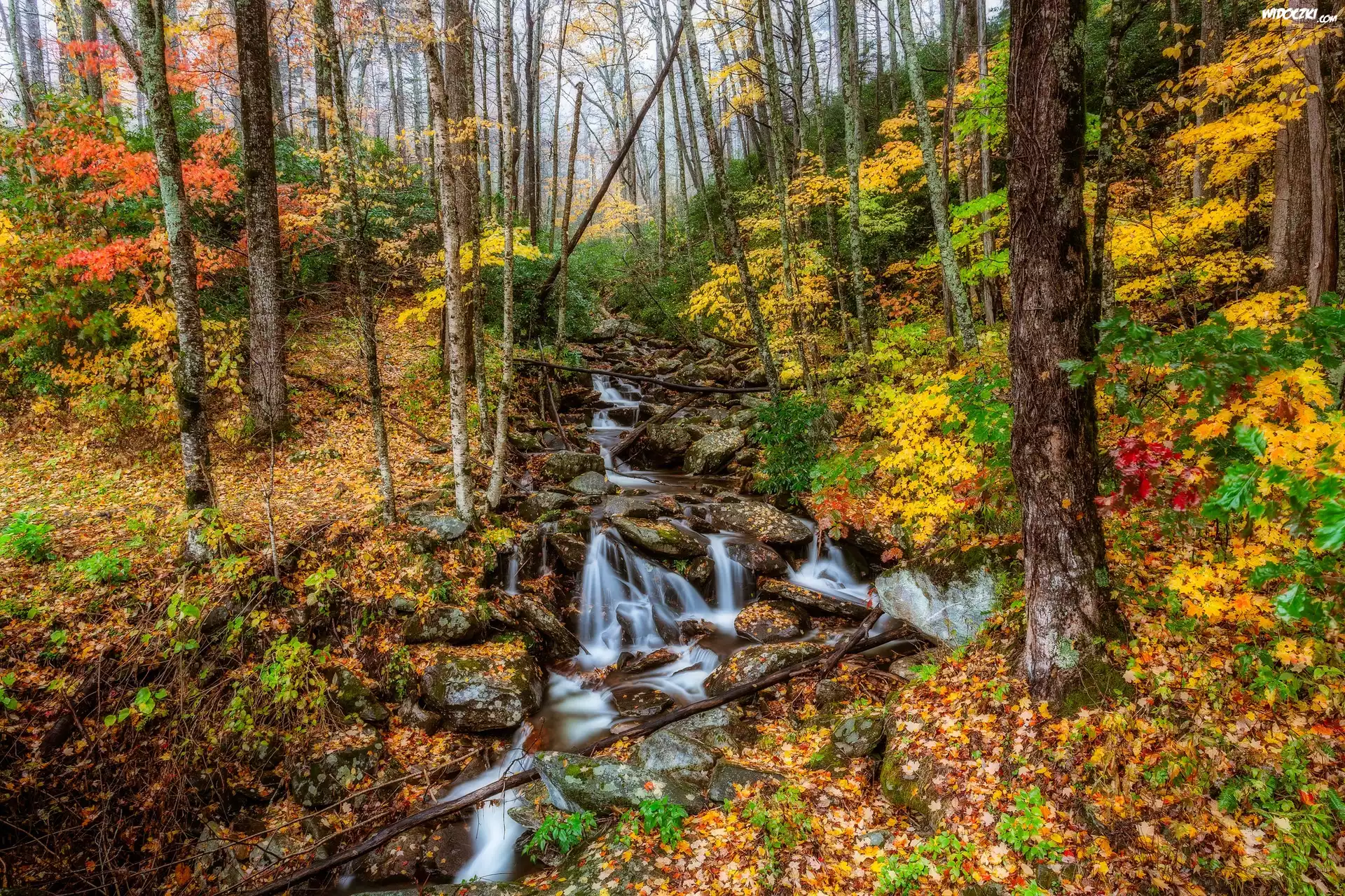 Zdjęcia, Jesień, Las, Kamienie, Strumyk, Mgła