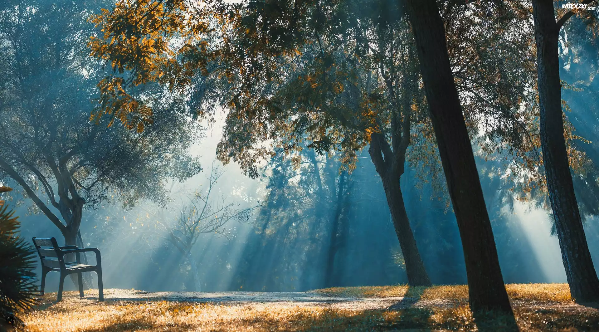 Jesień, Drzewa, Przebijające światło, Ławka