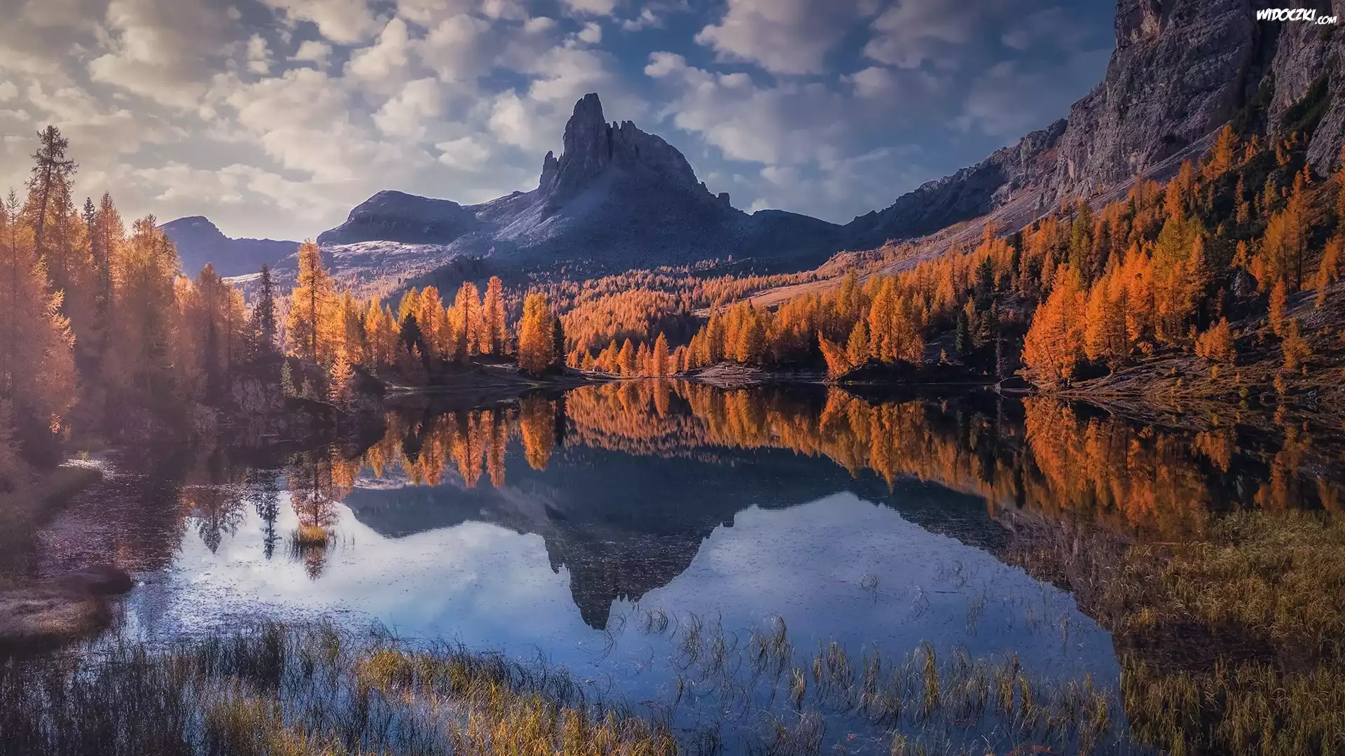 Zdjęcia, Jesień, Góry, Jezioro, Lago Federa, Żółte, Drzewa, Modrzew, Trawa, Włochy