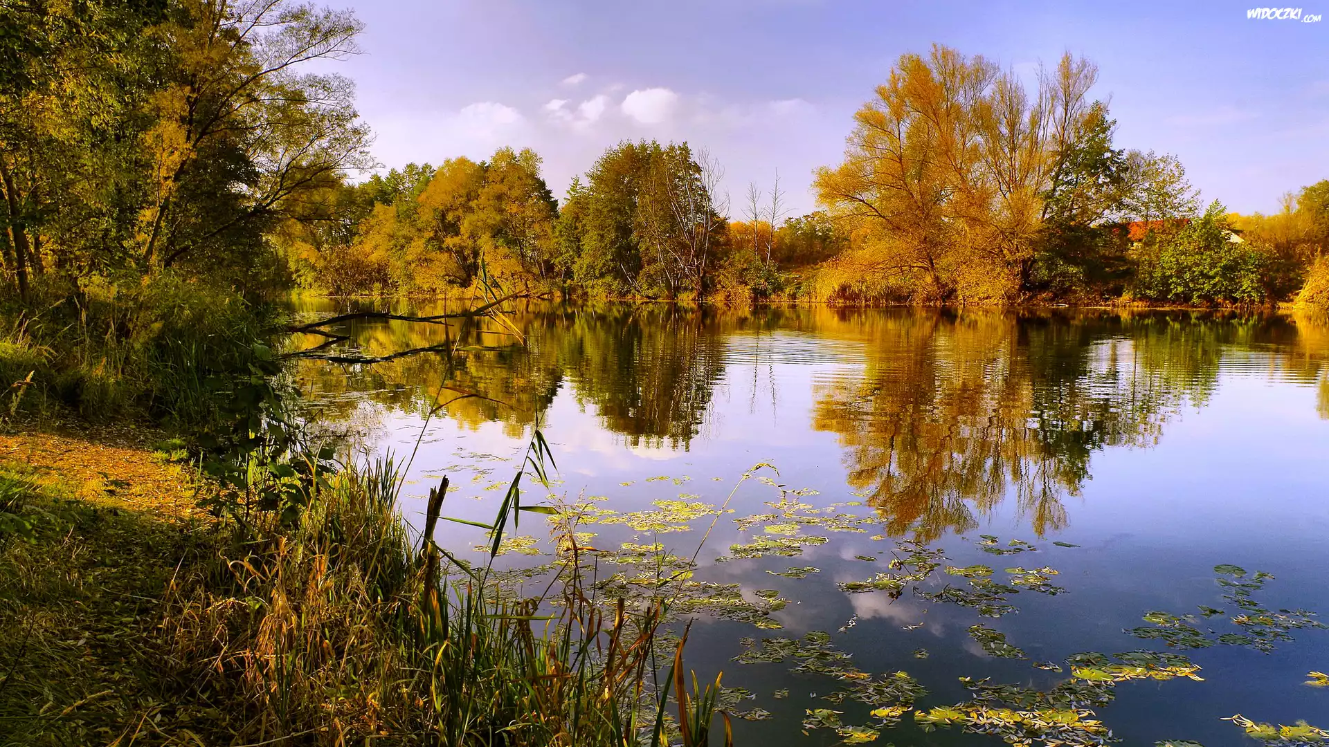 Zdjęcia, Jesień, Jezioro, Drzewa, Trzciny, Odbicie