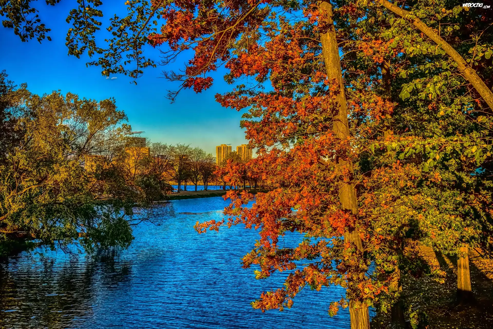 Zdjęcia, Jesień, Drzewa, Staw, Wieżowce, Miasto