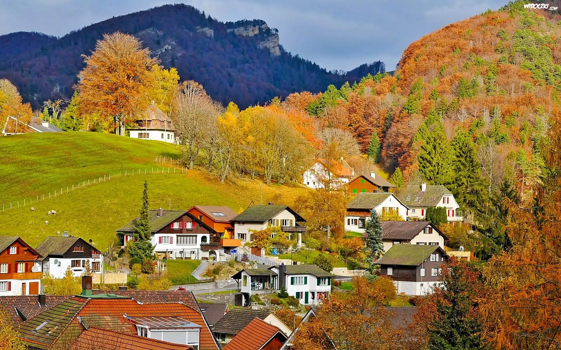 Zdjęcia, Jesień, Góry, Lasy, Łąki, Wioska, Alpejska