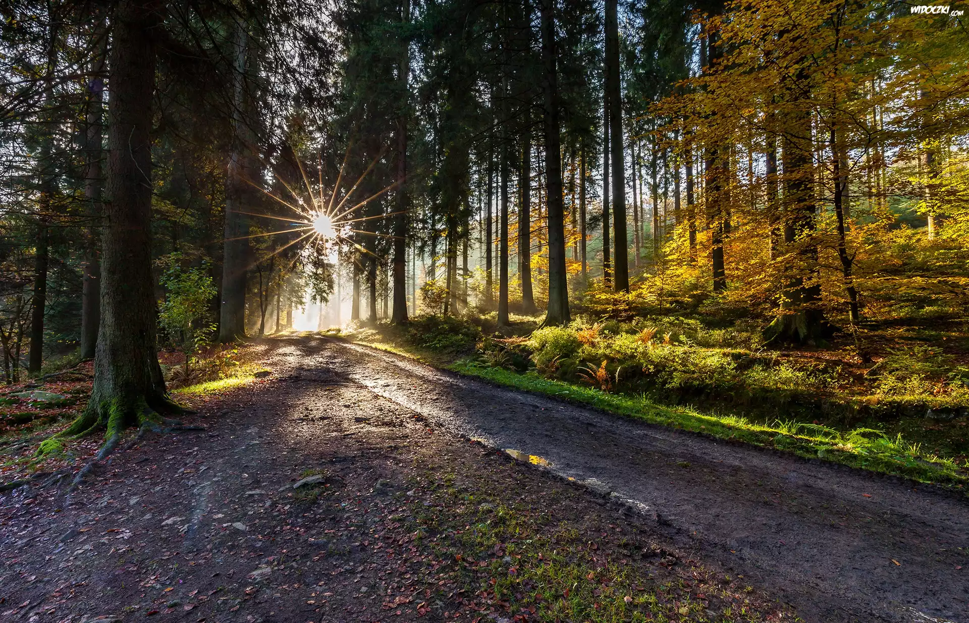 Jesień, Droga, Las, Promienie, Wschód słońca