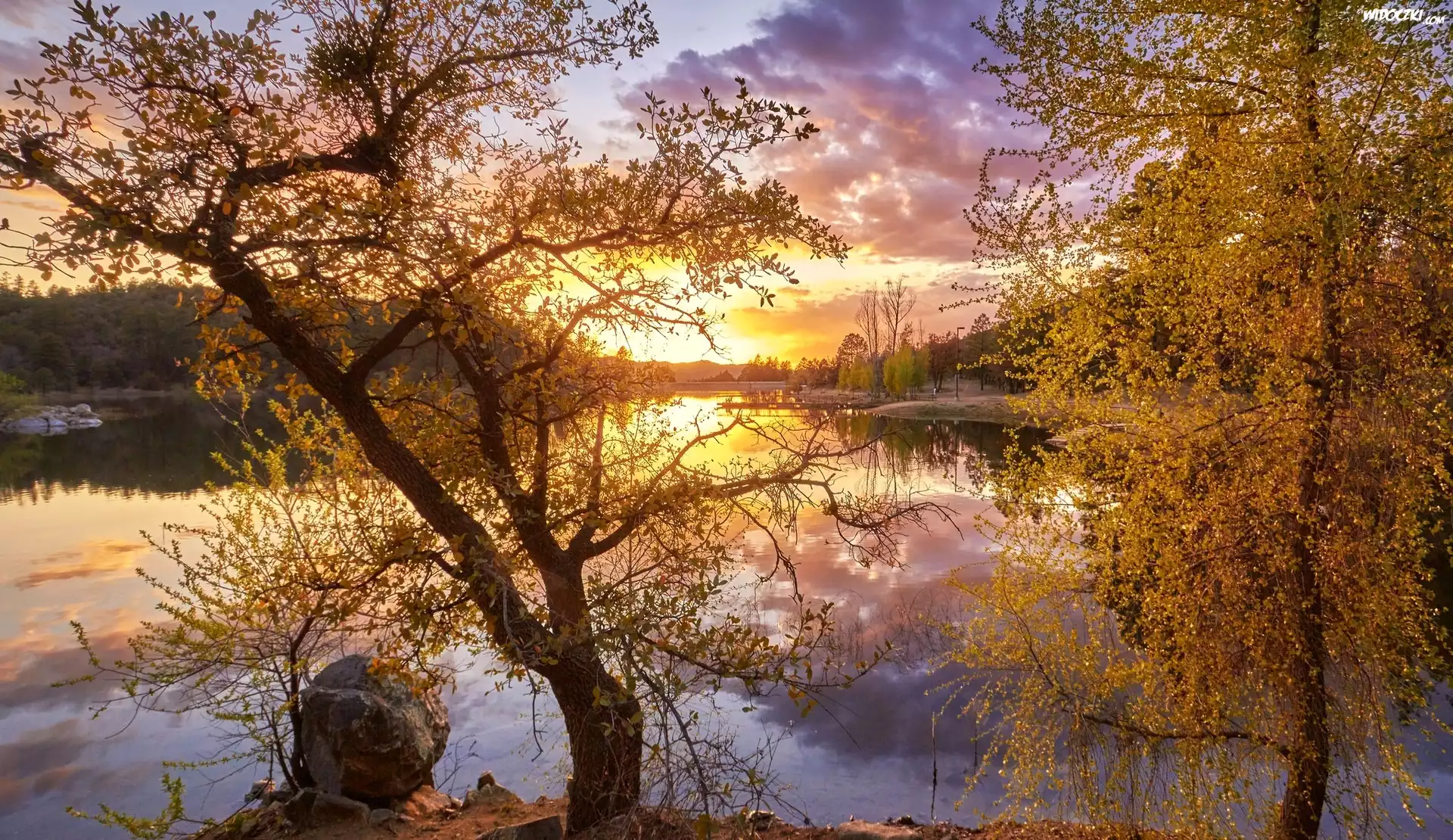 Jesień, Rzeka, Drzewa, Zachód słońca