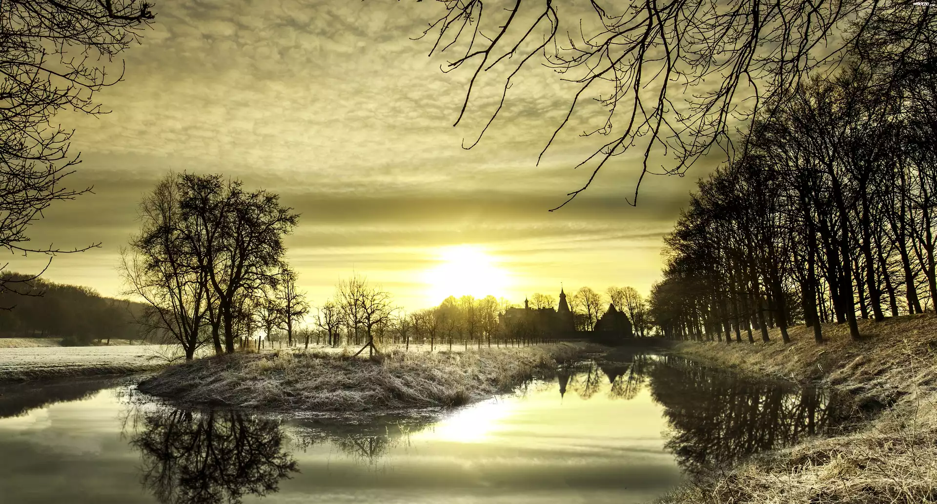 Jesień, Rzeka, Drzewa, Zachód, Słońca