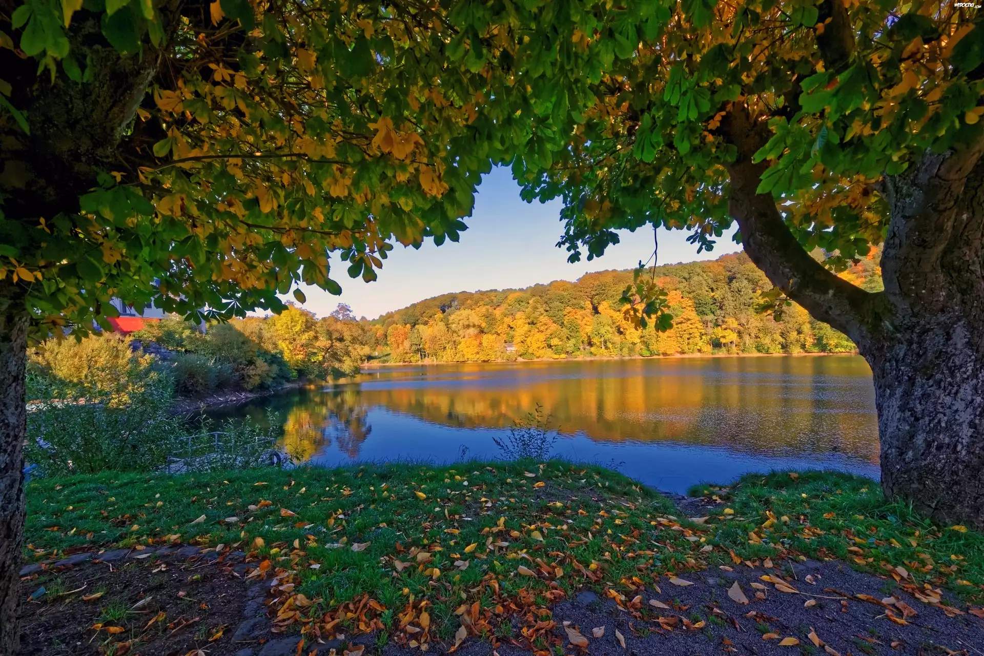 Jesień, Jezioro, Las, Zeschnięte, Liście