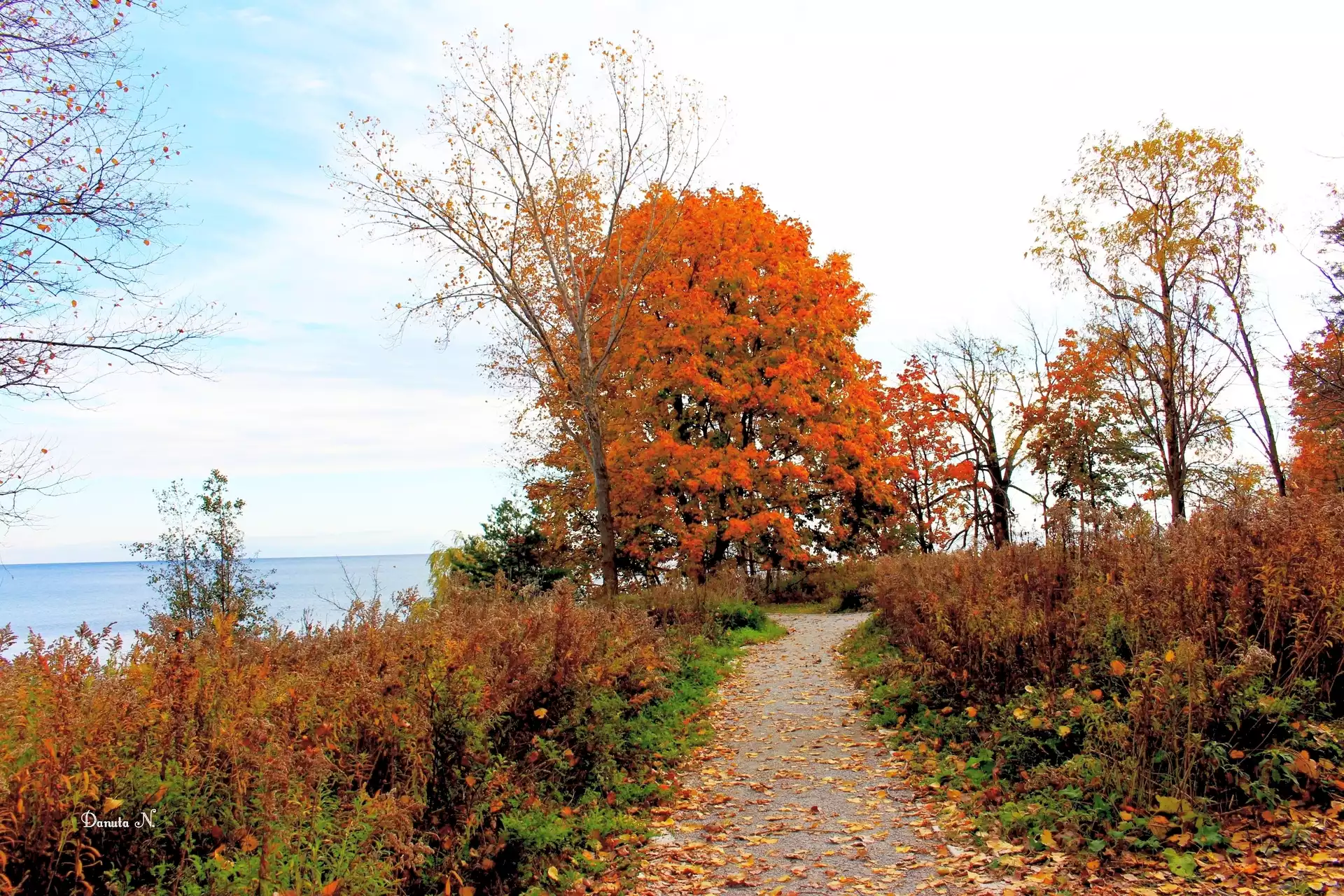 Jesienna, Aleja, Drzewa, Liście, Jezioro