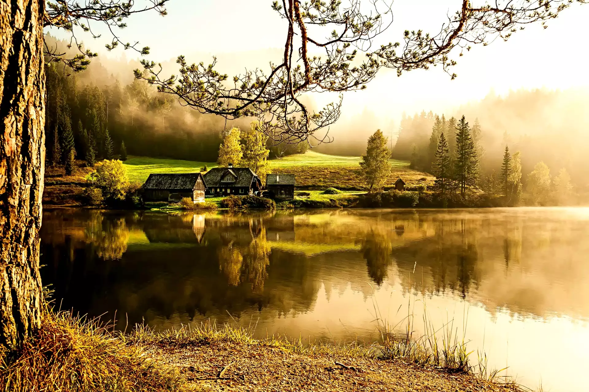 Piękna, Jesienna, Sceneria, Jezioro, Lasy, Mgła, Wioska