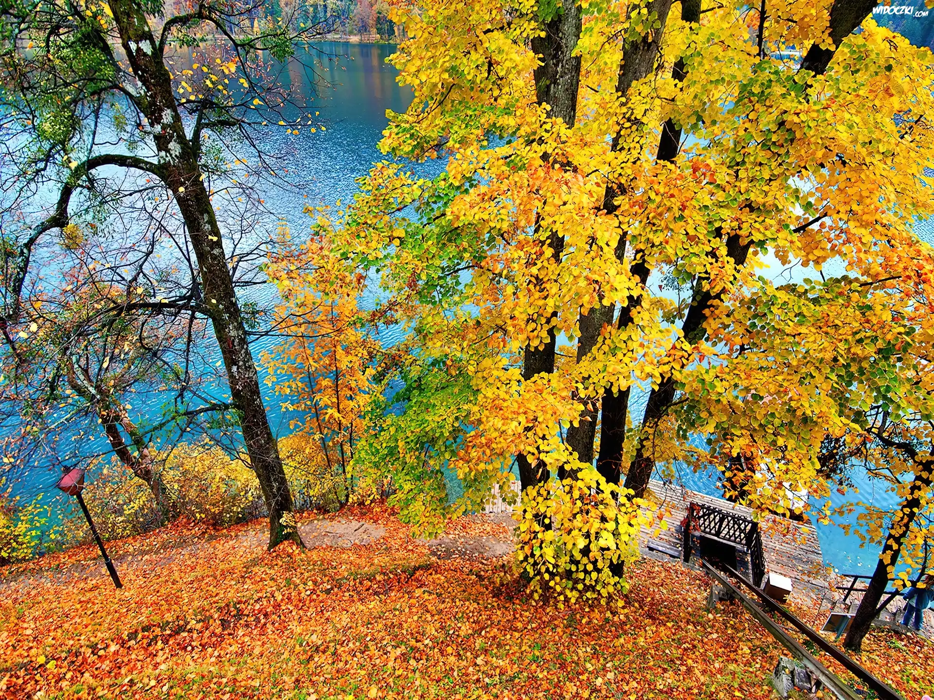 Jesienne, Drzewa, Pomost, Jezioro