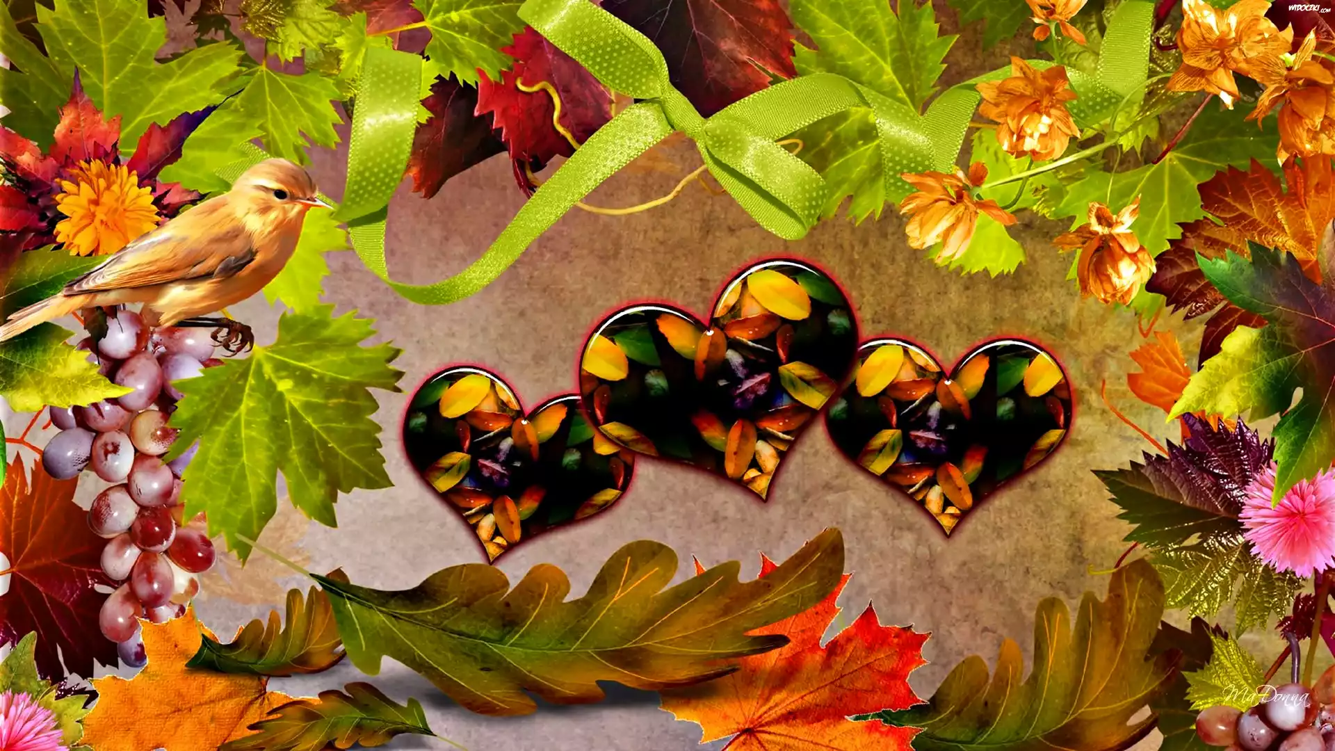 Jesienne, Liście, Ptaszek, Serca