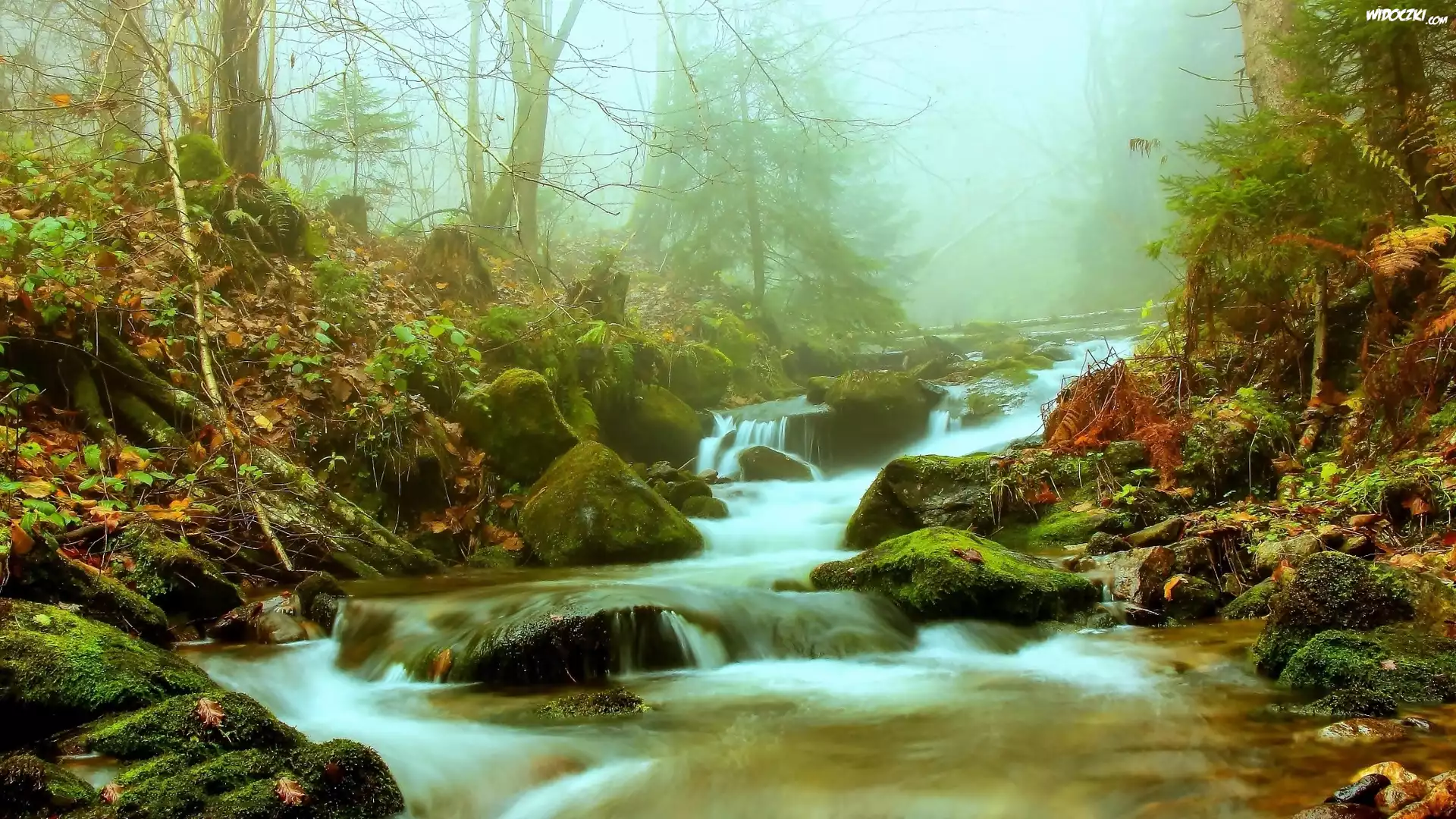 Zdjęcia, Jesienny, Las, Potok, Kamienie, Mgła