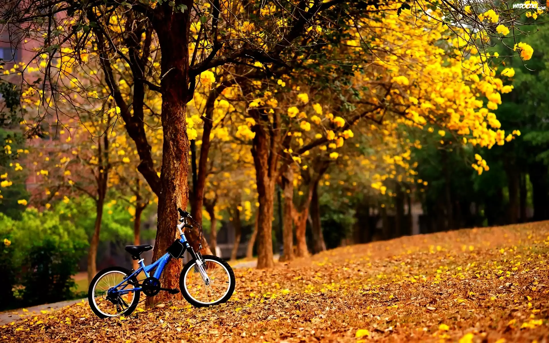 Jesienny, Park, Opadłe, Liście, Niebieski, Rower