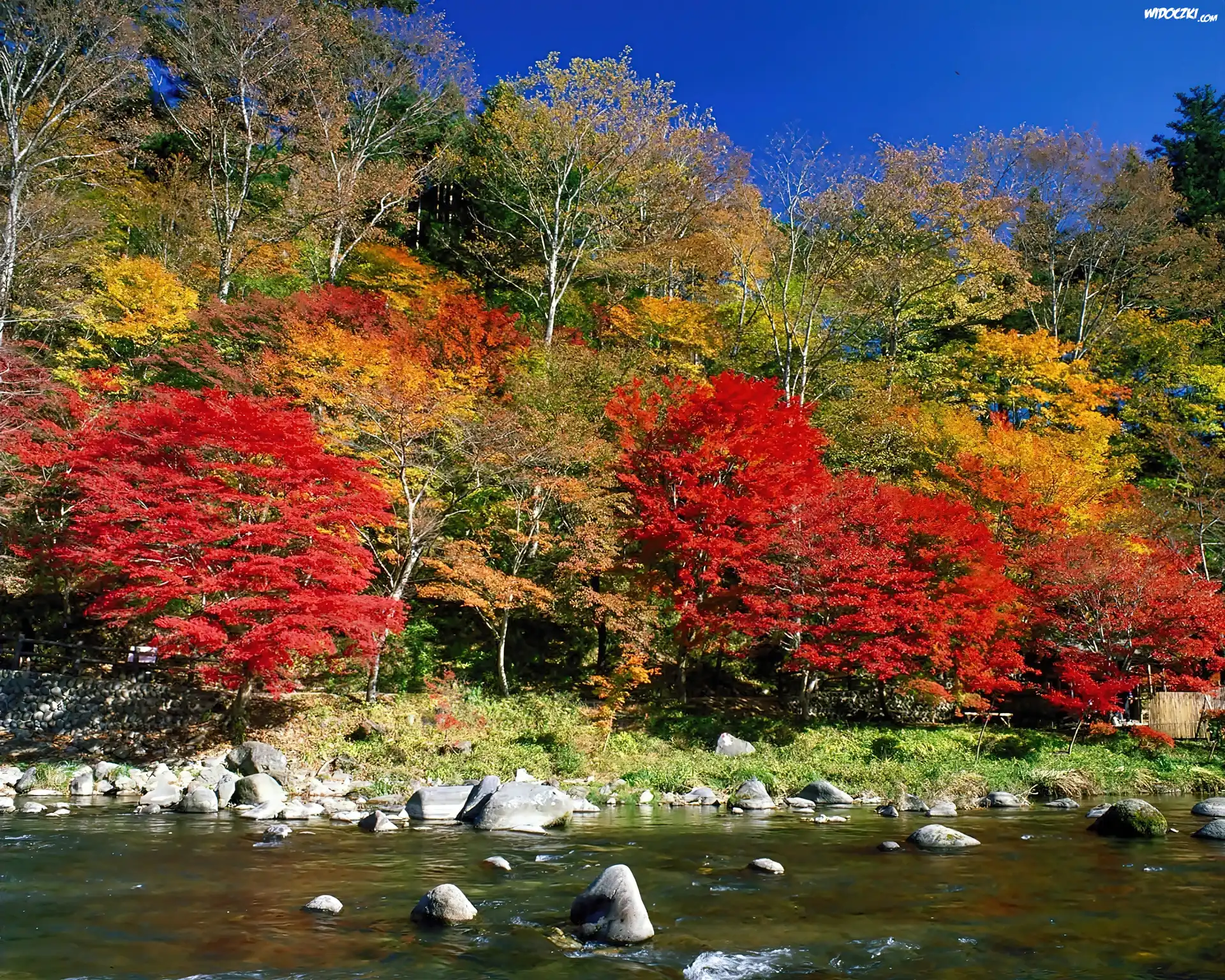 Zdjęcia, Jesienny, Las, Rzeka, Głazy