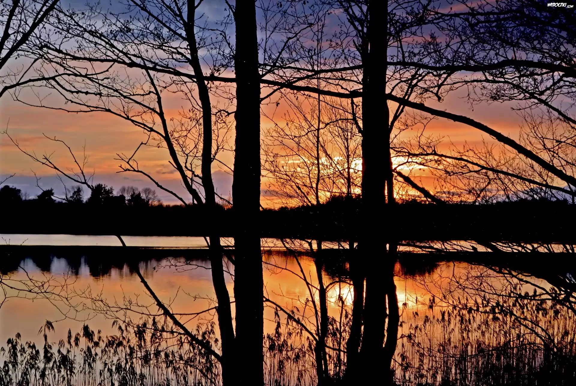 Zdjęcia, Jezior, Zachód, Słońca, Drzewa