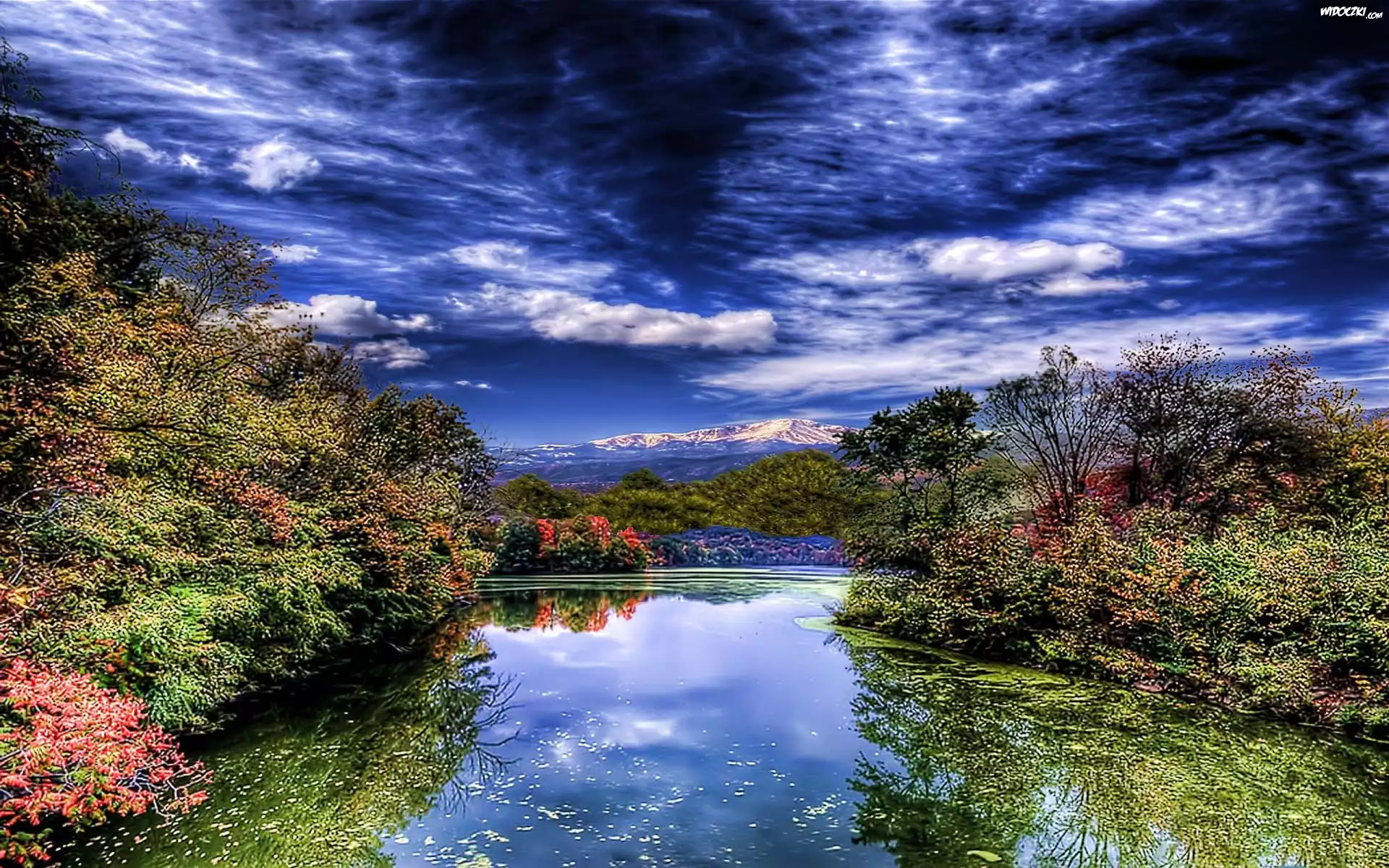 Zdj臋cia, Jeziora, Kolorowe, Krzewy, Chmury