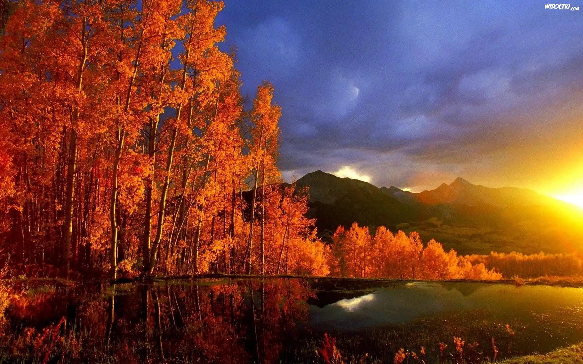 Jeziora, Drzewa, Góry, Zachody, Słońca