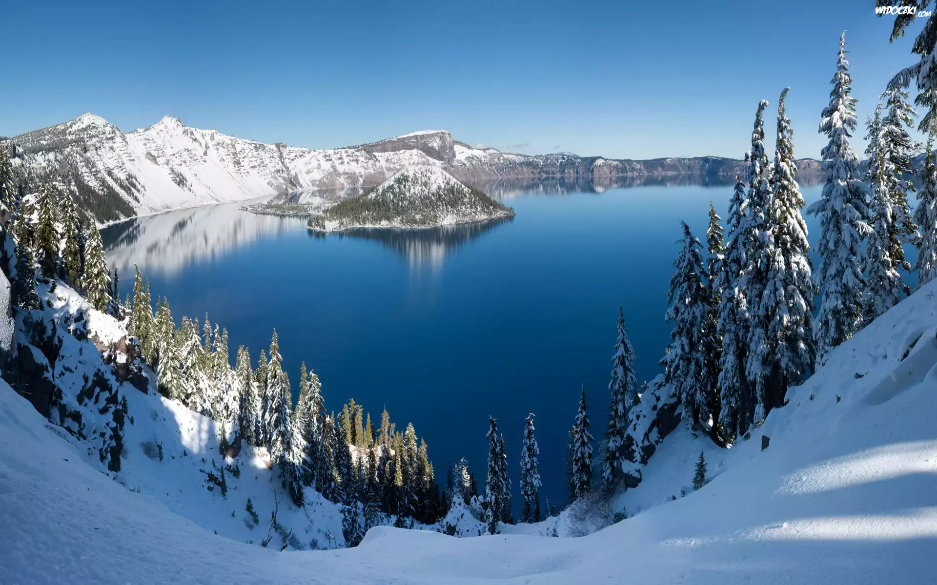 Zima, Jezioro Kraterowe, Park Narodowy Jeziora Kraterowego, Stany Zjednoczone, Oregon, Wyspa Czarodzieja |