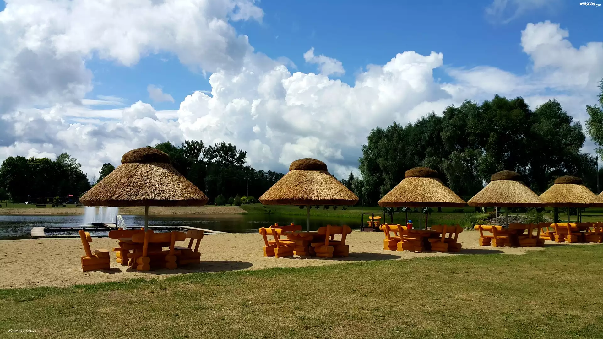 Zdjęcia, Jeziorko, Fontanna, Parasole, Stoliki, Ławki, Piasek