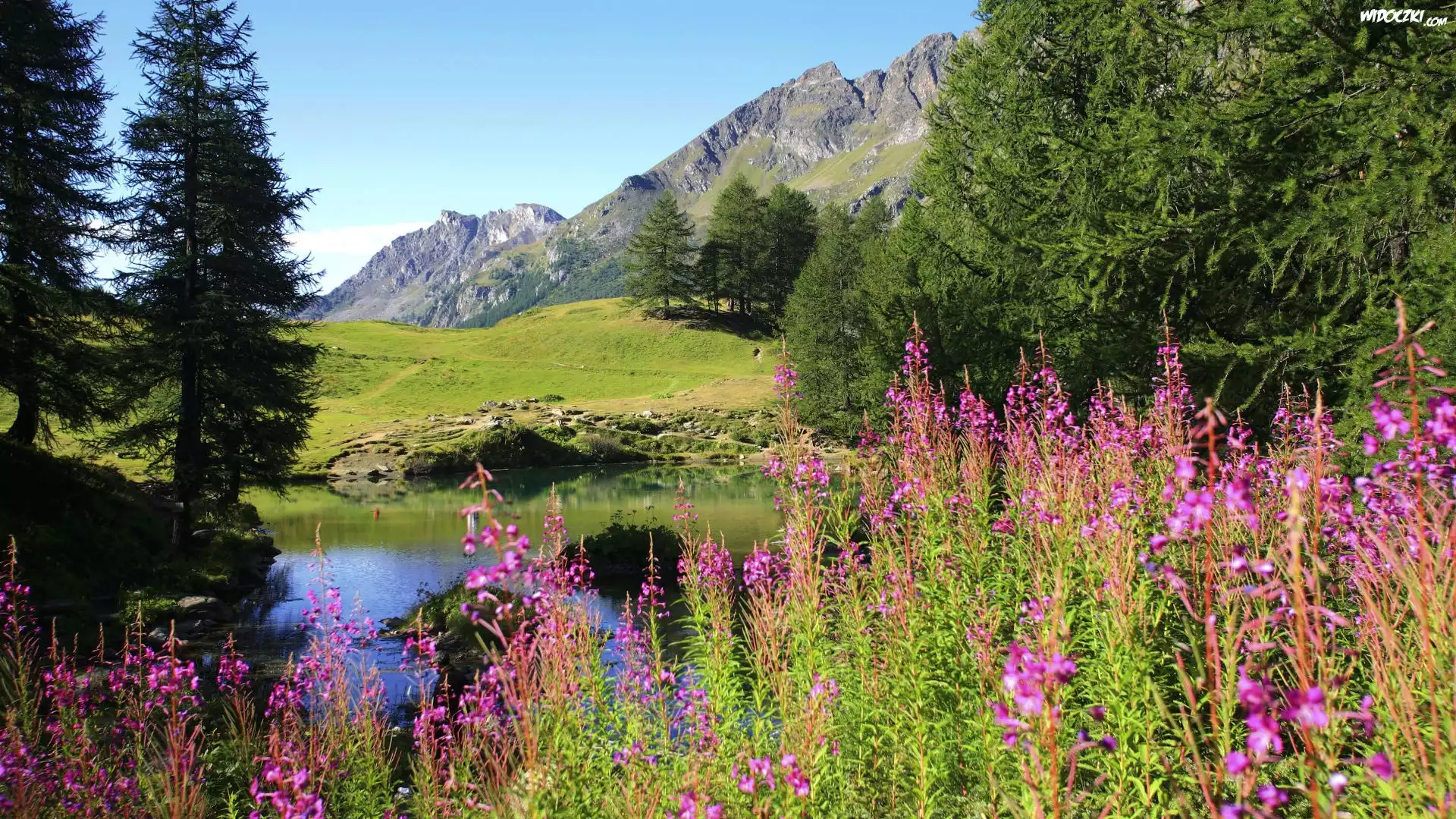 Zdjęcia, Jeziorko, Kwiatki, Drzewa, Góry