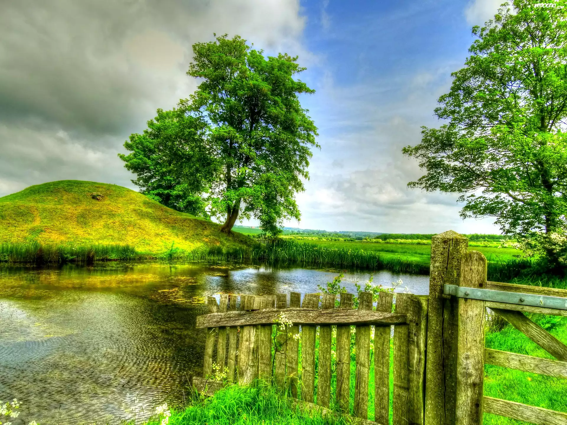 Jeziorko, Drzewa, Wzgórek, Płotek, Pole, HDR