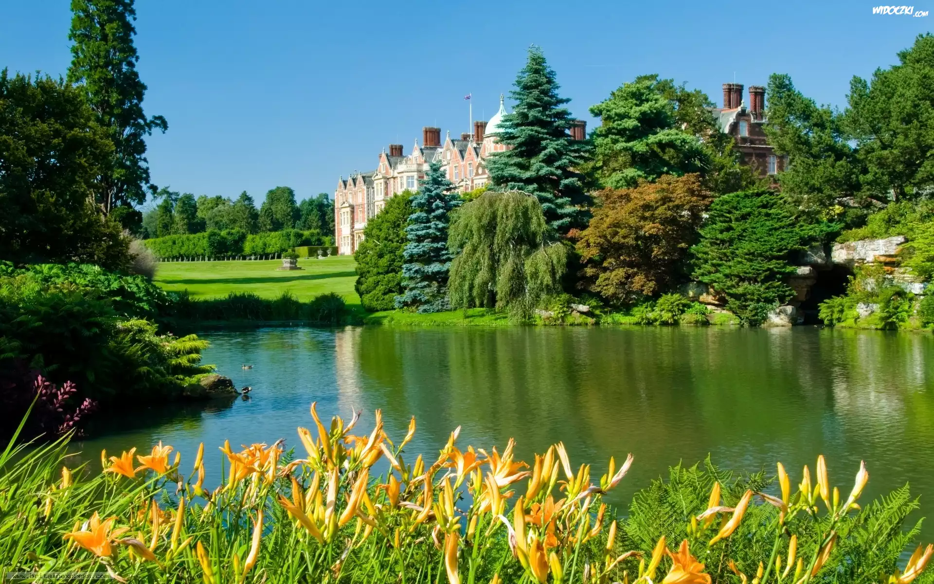 Zdjęcia, Jeziorko, Kwiatki, Drzewa, Pałac, Sandringham, Anglia