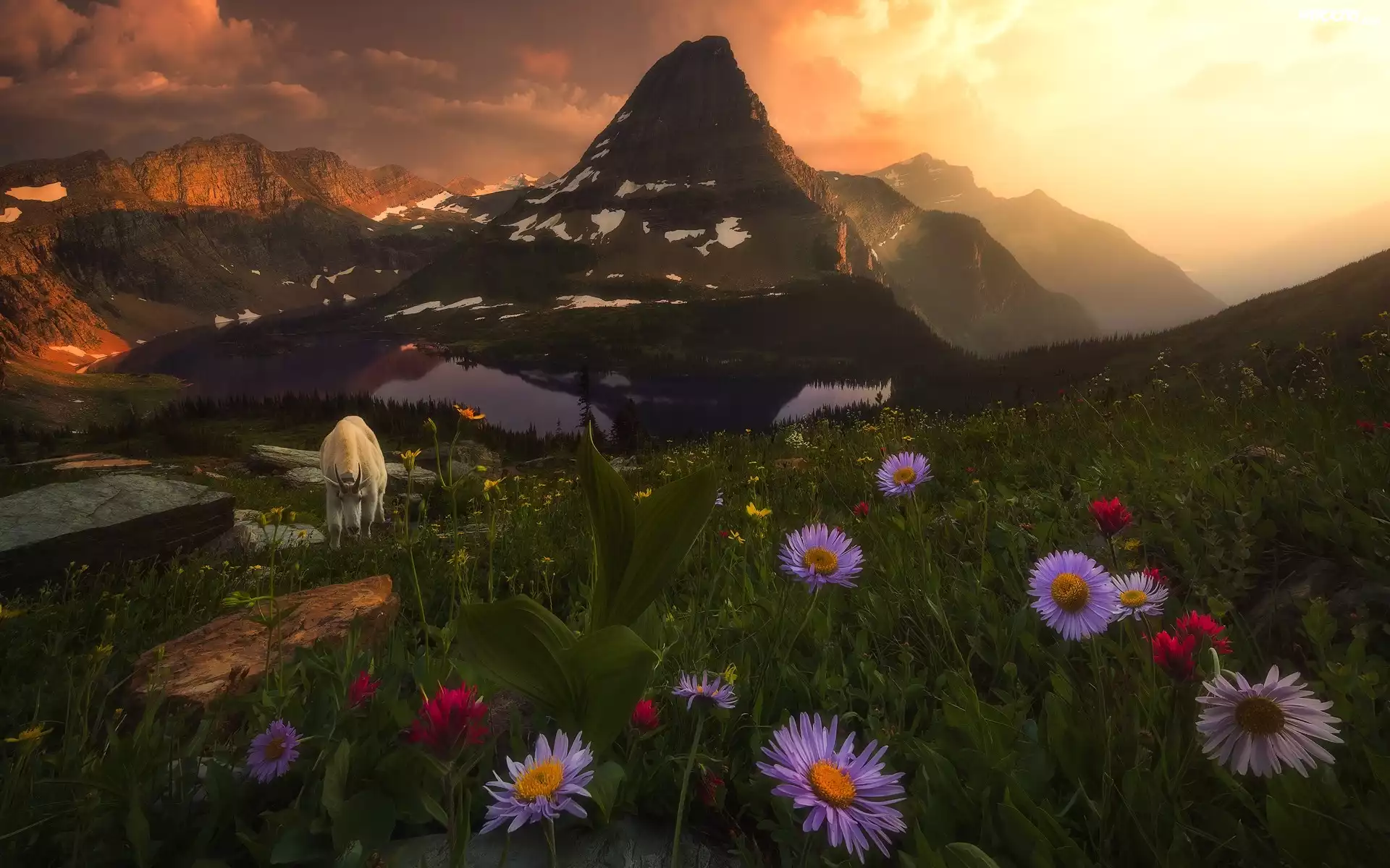 Zdjęcia, Góry, Jezioro, Kozioł śnieżny, Kwiaty, Drzewa, Chmury, Łąka