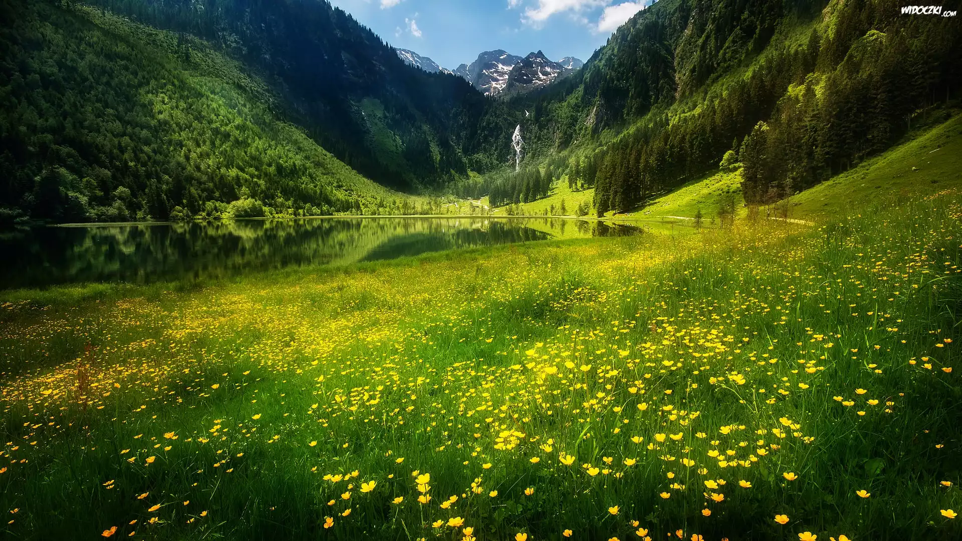 Zdjęcia, Jezioro, Góry, Wodospad, Łąka, Kwiaty