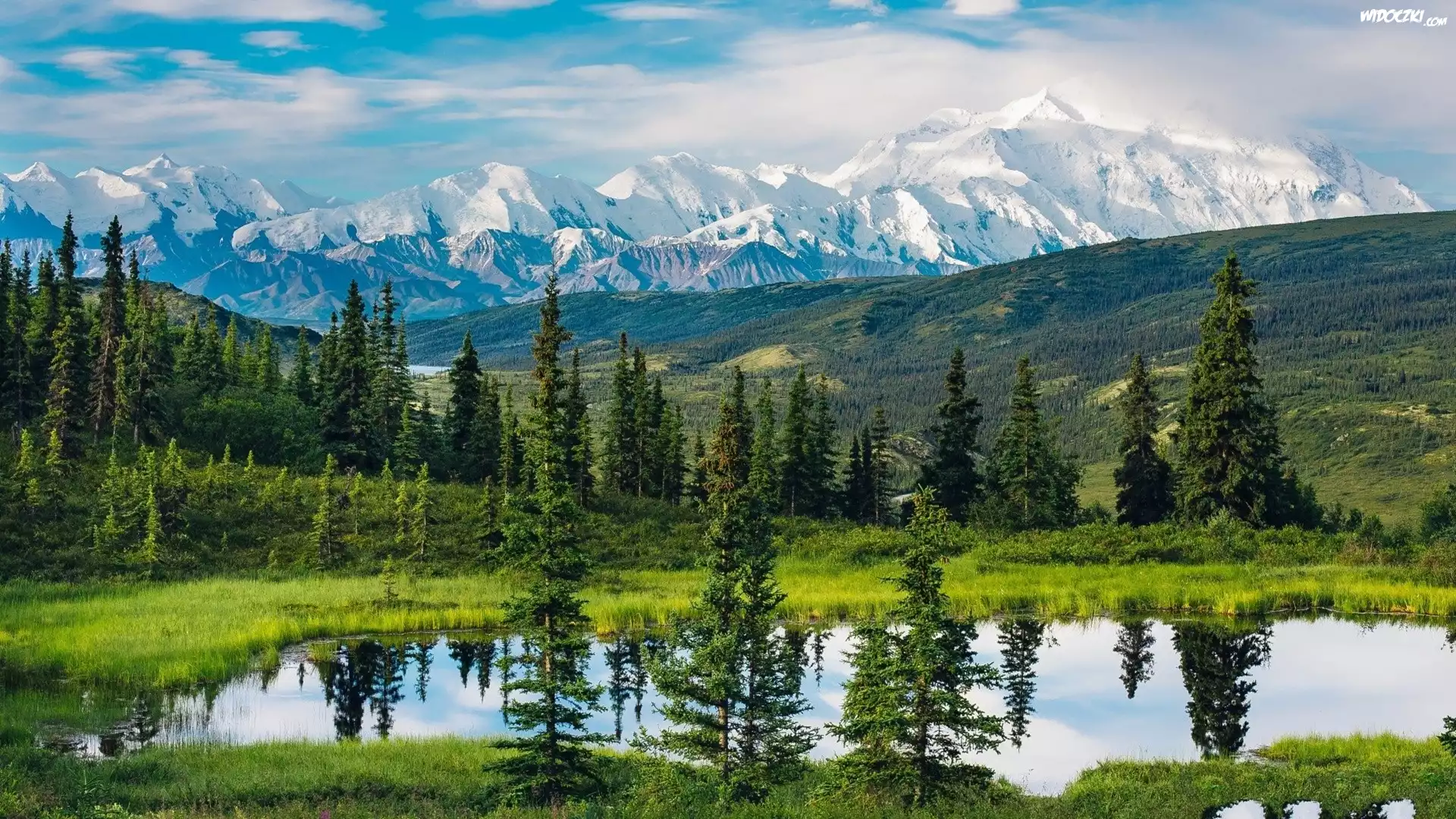 Zdjęcia, Stany Zjednoczone, Alaska, Góry, Park Narodowy Denali, Drzewa, Jezioro