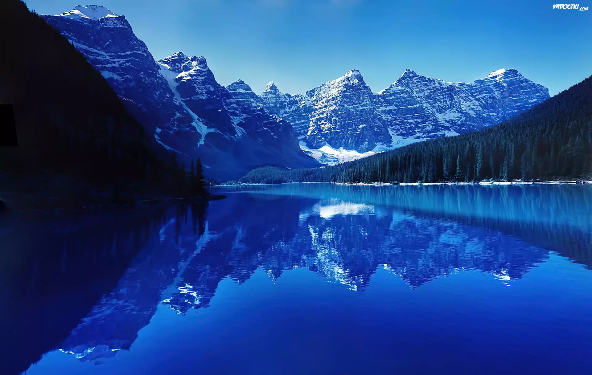 Zdjęcia, Jezioro, Ośnieżone, Góry, Drzewa, Alberta, Kanada