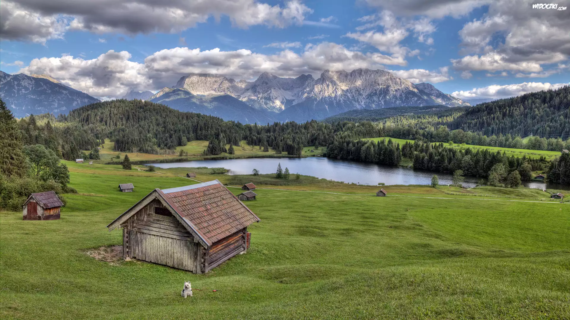 Jezioro Geroldsee, Góry, Alpy Bawarskie, Domki, Polana, Pies, Chmury, Drzewa, Lasy, Bawaria, Niemcy |