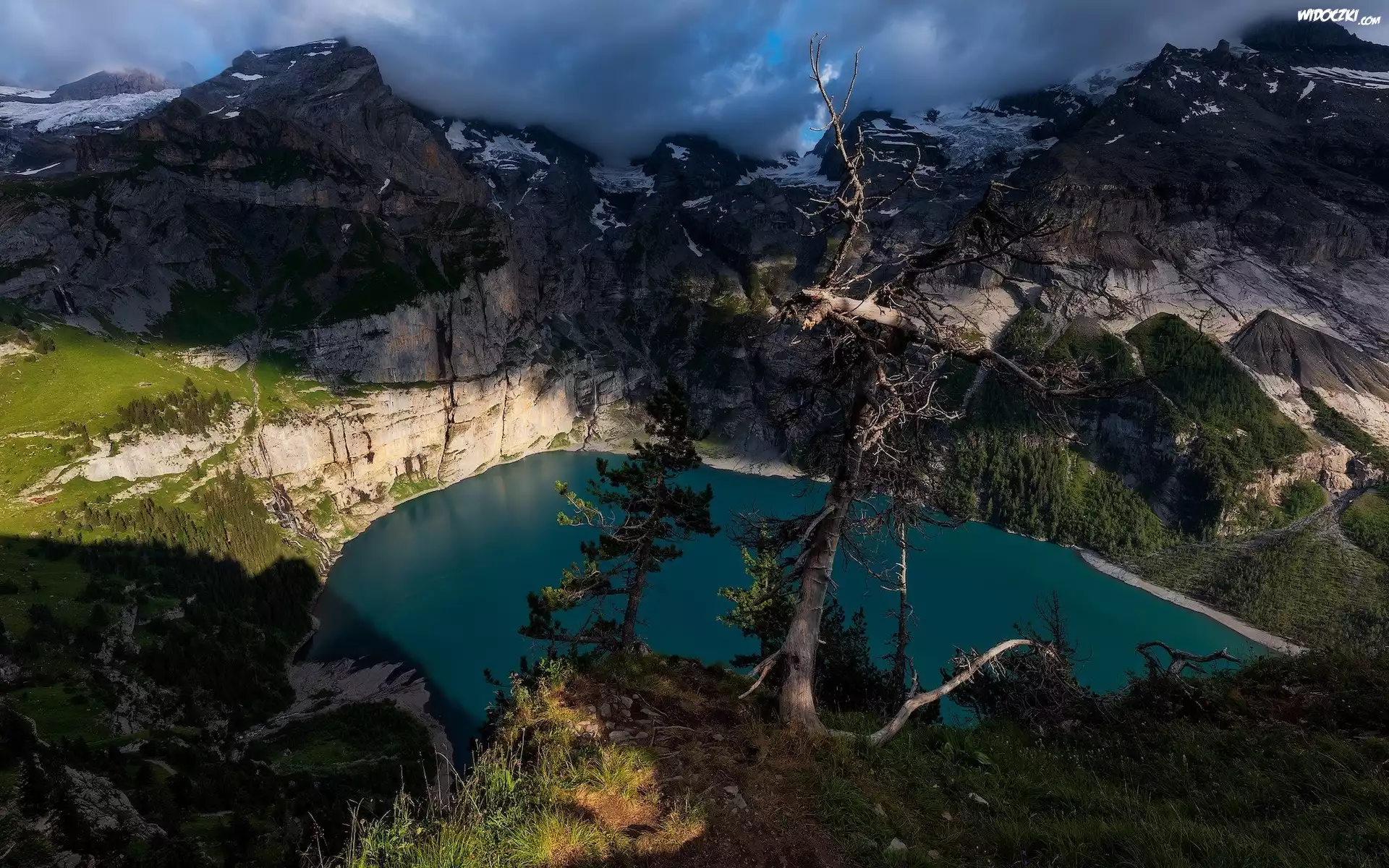 Zdjęcia, Szwajcaria, Góry, Alpy, Jezioro Oeschinen, Chmury, Drzewa