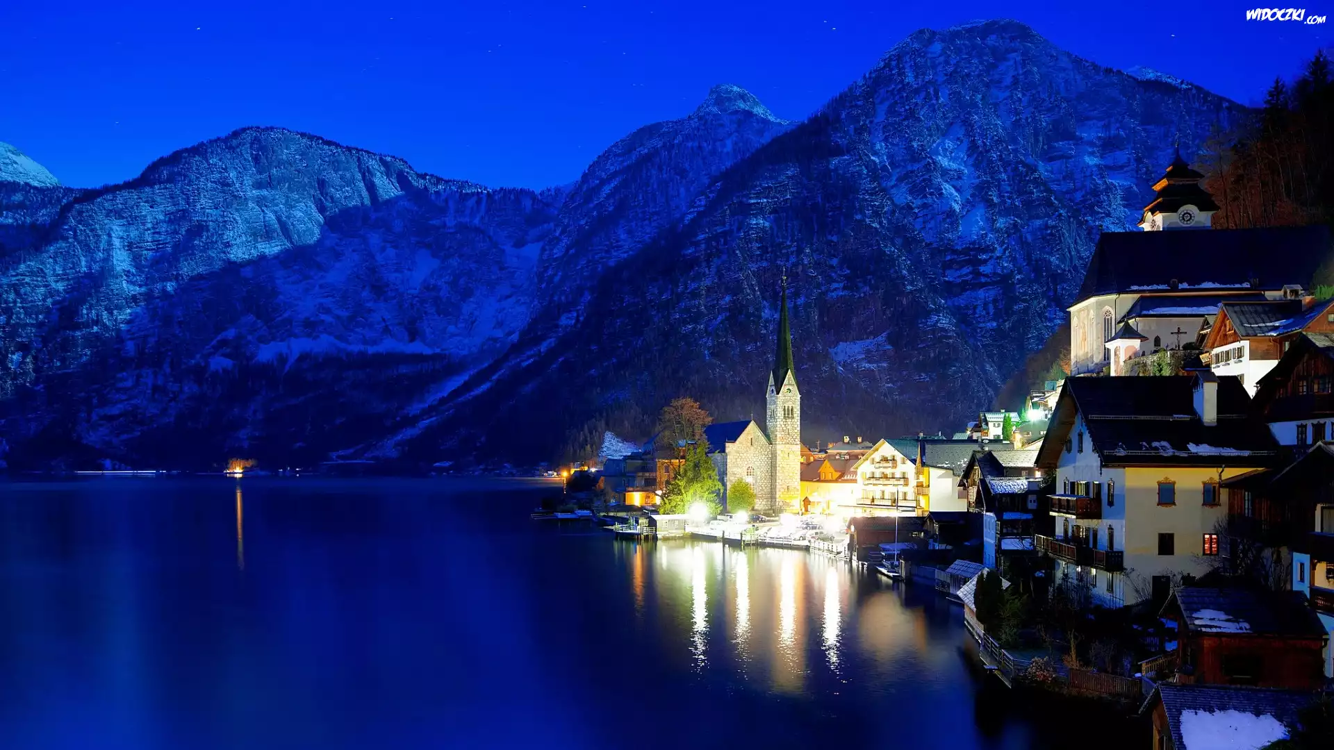 Zdjęcia, Austria, Alpy Salzburskie, Miasteczko Hallstatt, Jezioro Hallstättersee, Góry, Światła, Noc, Zima